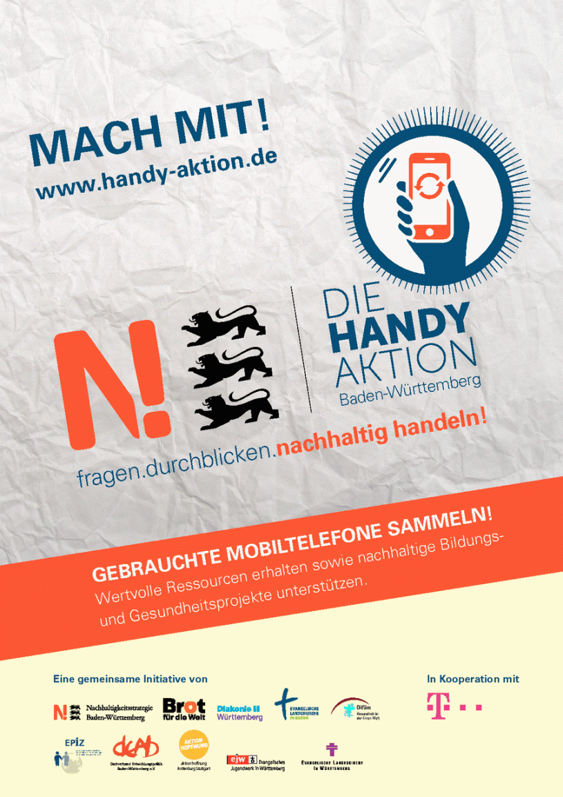 Die Handy-Aktion Baden-Württemberg ist eine landesweite Initiative vieler Organisationen aus Kirche und Zivilgesellschaft, der Nachhaltigkeitsstrategie Baden-Württemberg sowie der Deutschen Telekom Technik GmbH. Sie versucht, ein wichtiges Zeichen für einen nachhaltigen Konsum zu setzen, indem sie viele Materialien zum Einsatz im Schulunterricht und der Erwachsenenbildung anbietet.