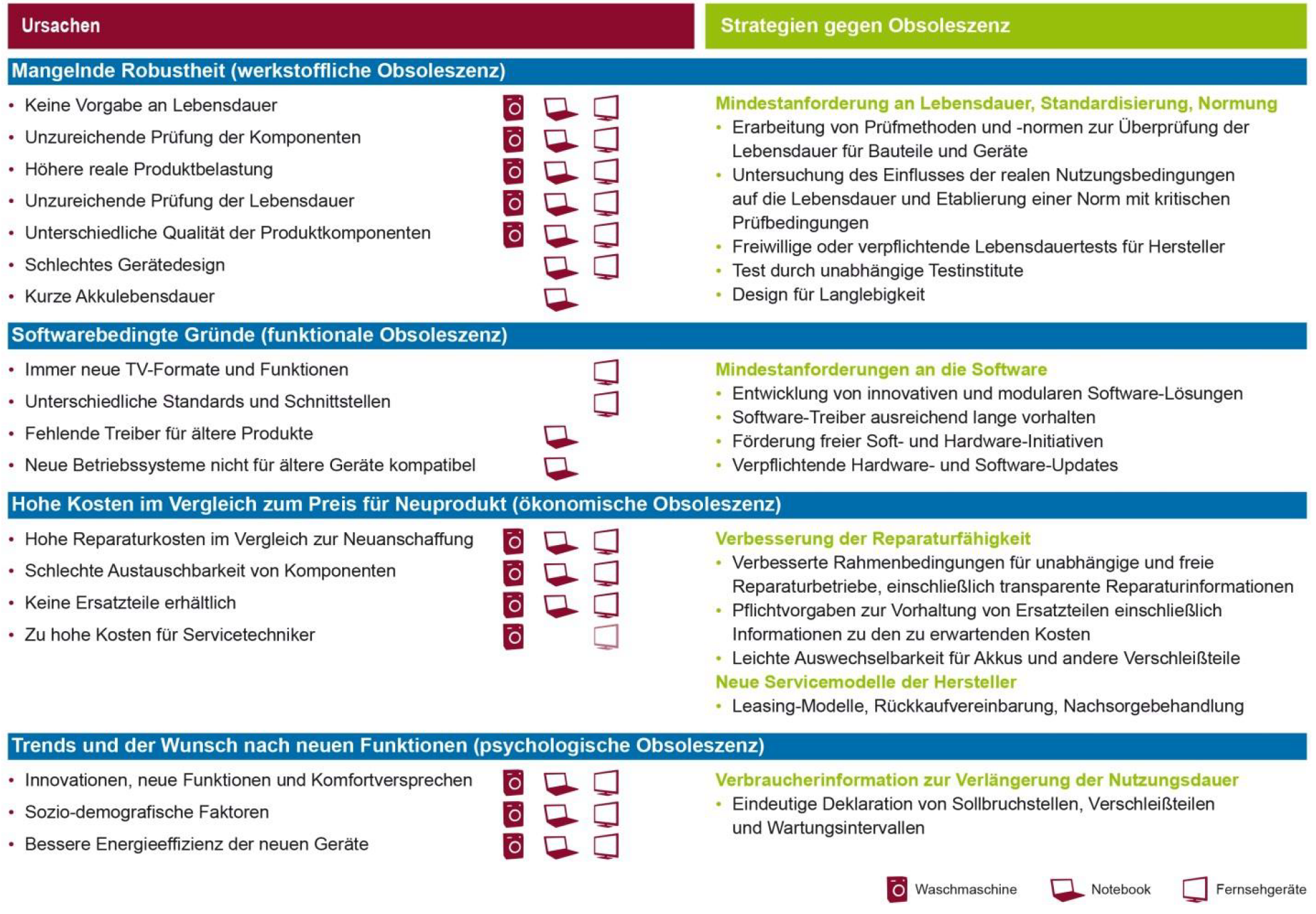 Am Ende des Ergebnisberichts schlägt das Öko-Institut Strategien für den Umgang mit Obsoleszenz vor. Insbesondere betonen die Autor*innen der Studie, dass aus Umweltgründen verlängerte Nutzungs- und Lebenszeiten der Produkte angestrebt sowie Defekte im frühen Nutzungszeitraum vermieden werden sollten (Öko-Institut e. V. 2016). Das Öko-Institut fasst erarbeitete Ursachen und sich daraus ableitende Lösungsoptionen in folgender Abbildung zusammen: