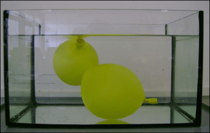 So bietet sich beispielsweise Folgendes an: Zwei Luftballons werden mit der exakt gleichen Menge Wasser befüllt – jedoch einmal mit normalem Leitungswasser und einmal mit stark salzhaltigem Wasser. Anschließend werden die Luftballons in ein großes mit Leitungswasser befülltes Gefäß gegeben (hier ist darauf zu achten, dass das Leitungswasser im Gefäß die gleiche Temperatur wie das Wasser in den Luftballonen hat!). Der salzwassergefüllte Luftballon ist aufgrund seiner höheren Dichte schwerer als das Umgebungswasser und als der andere Ballon und sinkt deshalb ab. Der leitungswassergefüllte Ballon, dessen Inhalt die gleiche Dichte wie das umgebende Wasser aufweist, steigt im Becken auf bzw. gleitet im Wasser. (vgl. Schulbiologiezentrum 2016, s. o.)