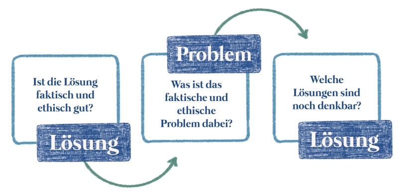 Man darf also insgesamt nicht an der Stelle stehen bleiben, an der nur die kritische ethische Prüfung der Lösung erfolgt. Der Fokus muss vielmehr darauf gelegt werden zu fragen, wie eine gute ethische Lösung aussieht und welche Kriterien dafür entscheidend sind. Nur so kann ethisches Fragen auch lösungsorientiert verstanden werden und bleibt nicht am Ende doch bei einer Problemfokussierung hängen.