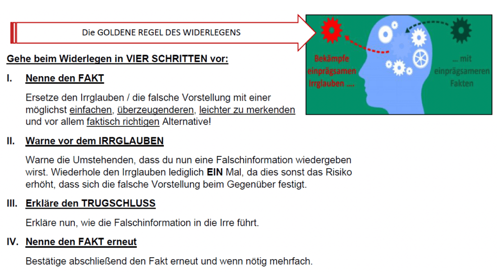 Zur Widerlegung von Falschinformationen sollte eine klare Strukturierung der Gegenargumente eingehalten werden (vgl. Lewandowsky et al., 2020, S.12; Cook, 2020a, S.150). Das Argument der Widerlegung sollte mit dem wahrheitsgetreuen Fakt eingeleitet werden. Als Nächstes sollte der Irrglaube wiederholt werden, jedoch sollte ihm eine Warnung vorangehen, um den Rezipient*innen deutlich zu machen, dass die Information unwahr ist. Die Falschinformation darf auf keinen Fall unkommentiert wiedergegeben werden und sollte im Idealfall nicht mehr als einmal wiederholt werden. Nach der kritischen Formulierung des Irrglaubens sollte die Erklärung des Trugschlusses folgen, bei dem darauf hingewiesen wird, warum die zuvor erwähnte Fehlinformation in die Irre führt, folgen. Zum Abschluss des Widerlegungsarguments sollte auf jeden Fall der Fakt, der bereits zu Beginn des Argumentes genannt wurde, wiederholt werden, da dieser zum Abschluss dem Zuhörer im Gedächtnis bleiben soll. Nach Lewandowsky et. al. ergibt sich so ein Gegenargument in der Struktur Fakt-Irrglaube-Trugschluss-Fakt, was die Verbreitung der Falschinformation deutlich verlangsamen kann (2020, S. 12).