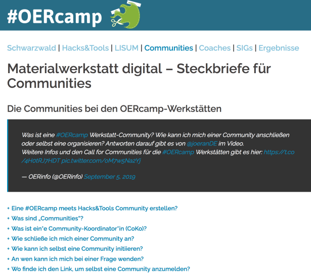 Mini-Online-Kurs zur Erstellung eigener OER im Bereich BNE (offenes Angebot aus dem eBildungslabor in Kooperation mit dem Portal Globales Lernen). - OERcamps sind Treffen von Praktikerinnen und Praktikern zu digitalen und offenen Lehr- und Lernmaterialien im deutschsprachigen Raum, die in unterschiedlichen Städten stattfinden mit der Möglichkeiten für Austausch und Vernetzung.