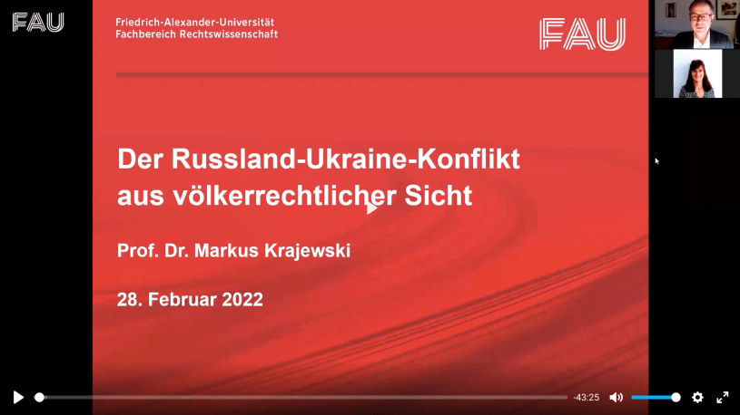 Die gewaltsame Eskalation des Konflikts zwischen der Ukraine und Russland, die bewaffneten Angriffe Russlands auf die Ukraine und mögliche Reaktionen anderer Staaten und der Staatengemeinschaft hierauf werfen zahlreiche völkerrechtliche Fragen auf: Kann eine Verletzung des Gewaltverbots gerechtfertigt werden? Wie ist die Rechtsstellung der „Volksrepubliken“ Donezk und Lugansk zu bewerten? Kann auf den Krieg mit völkerrechtlichen Maßnahmen reagiert werden? Diesen Fragen geht Prof. Dr. Markus Krajewski, Inhaber des Lehrstuhls für öffentliches Recht und Völkerrecht nach.