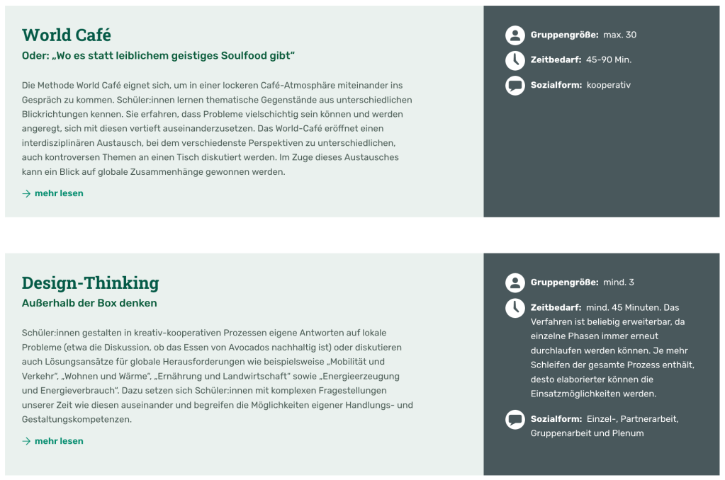 Die großen Herausforderungen für Lehrkräfte im Feld der Bildung für Nachaltigkeit werden im projekt ernst genommen, indem untersucht wird, wie diese in ihrer Arbeit durch eine wissenschaftsbasierte fachliche Analyse interdisziplinärer Ansätze wie auch durch die Erforschung fachdidaktischer Zugänge im Kontext einer Bildung für nachhaltige Entwicklung unterstützt werden können. Ein Ergebnis der damit verbunden Überlegungen ist das sogenannte Methodenmuster – hierunter werden einige ausgewählte Unterrichts- oder Arbeitsmethoden verstanden, die vor allem eine diskursive, bewertungsoffene Auseinandersetzung mit doppelt-komplexen Fragestellen (faktisch und ethisch) anregen.