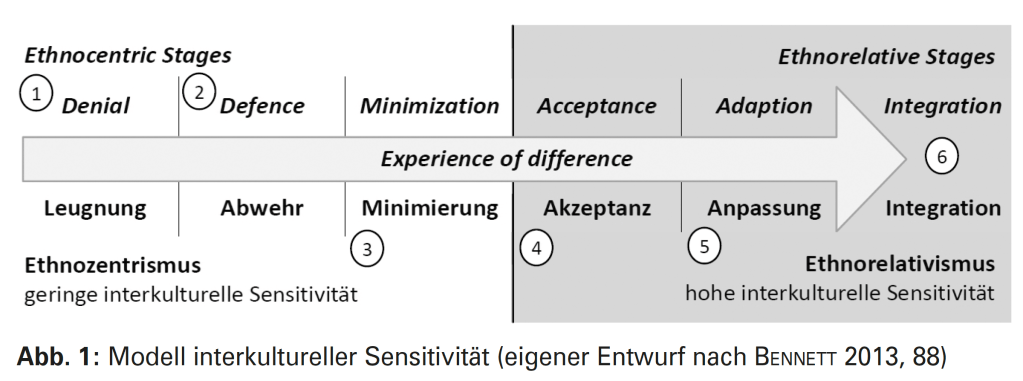 - Auf der Stufe 1 der Leugnung (Denial) zeigt sich eine Person als unfähig, kulturelle Unterschiede zu erkennen und äußert kein Interesse an fremden Kulturen und Menschen. Auf der Stufe 2 der Abwehr oder Umkehr (Defense) werden bereits kulturelle Unterschiede erkannt und diese können auch als solche beschrieben werden. Sie sind allerdings verbunden mit einem negativen Bewerten des Fremden oder Anderen und einem positiven Bewerten des Eige-nen. Man spricht von einer starken Polarisierung zwischen „Wir“ und „Ihr“, neutrale Aussagen über Fremde sind nicht möglich.