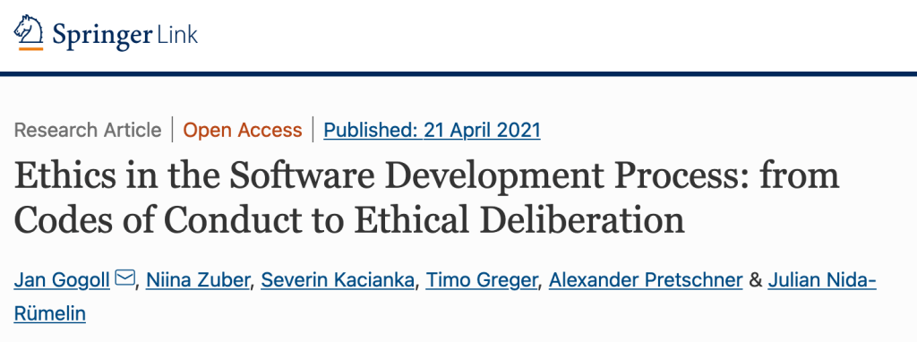 “Ethics in the Software Development Process”: from Codes of Conduct to Ethical Deliberation Philosophy & Technology 34 1085–1108 (2021). Jan Gogoll, Niina Zuber, Severin Kacianka, Timo Greger, Alexander Pretschner & Julian Nida-Rümelin https://link.springer.com/article/10.1007/s13347-021-00451-w