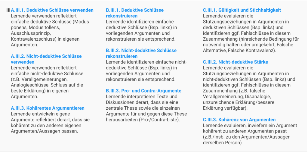 Um argumentative Fähigkeiten nachhaltig zu fördern, müssen sie systematisch spiralcurricular entwickelt und dazu in spezifische Teilkompetenzen und Kenntnisse zerlegt werden, die auf verschiedenen Niveaustufen erworben, eingeübt, angewendet und reflektiert werden können. Allerdings sind in den meisten Lehrplänen für den Philosophie- oder Ethikunterricht bisher nur eher allgemeine Abschlussstandards formuliert.