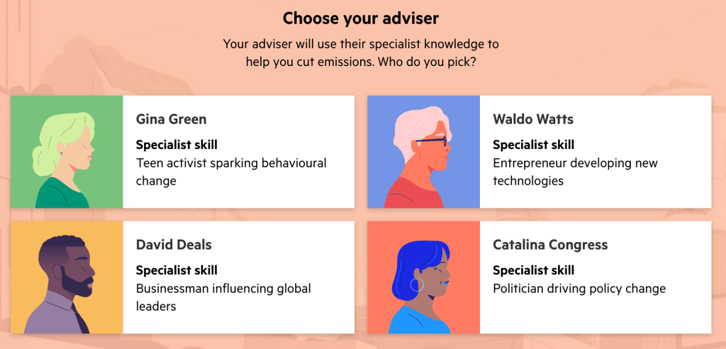 Das von der „Financial Times“ in Zusammenarbeit mit dem Softwarehersteller „Infosys“ entwickelte Spiel „The Climate Game„ bringt diese Herausforderungern in einem Spiel zusammen, das in jeder Runde verschiedene Handlungsoptionen anbietet und anschließend die daraus resultierenden Folgen aus globaler Perspektive aufzeigt. Zu Beginn muss gewählt werden, welche spezielle Expertise dem*der Spieler*in zur Verfügung steht. Anschließend durchläuft man die einzelnen Runden, um die gesteckten globalen Ziele zu erreichen.