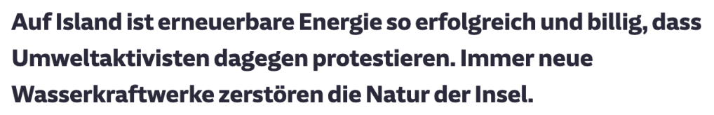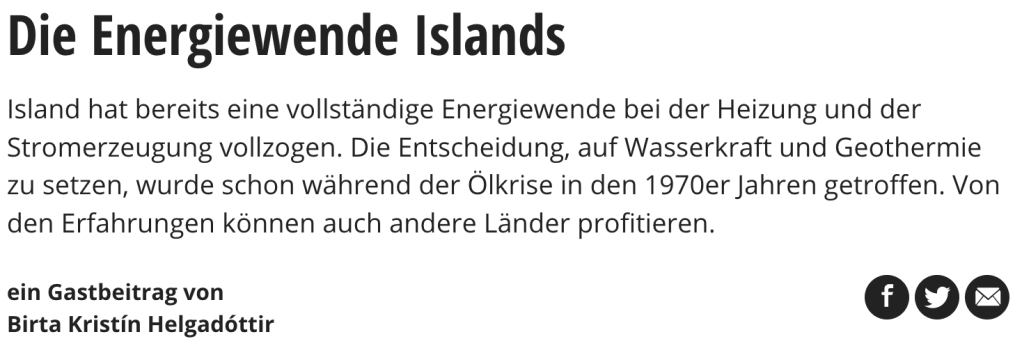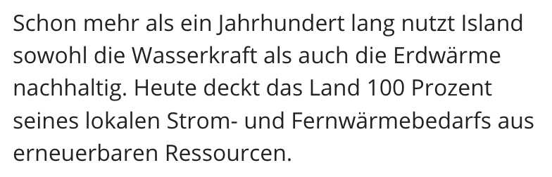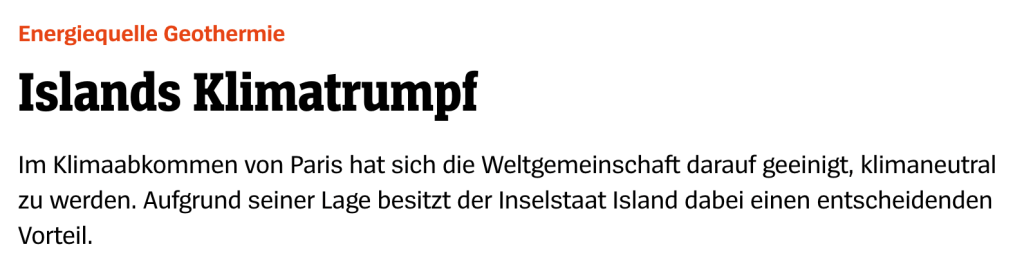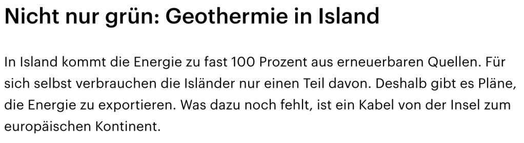 Die Geothermie wird gemeinhin als nachhaltige Lösung für den Energiewende propagiert; Island gilt in dem Feld als Vorreiter, da das Land heute 100 Prozent seines lokalen Strom- und Fernwärmebedarfs aus erneuerbaren Ressourcen deckt (70% Wasserkraft und 30% Geothermie). Der folgenden Galileo-Beitrag, der als Einstieg in die Fallanalyse verwendet werden kann, macht die starken Potentiale der Technologie und die Begeisterung über diese am Beispiel des Bananenanbaus in Gewächshauskulturen in Island deutlich. Zugleich können damit auch Fragen der Umgestaltung des Naturraumes und Grenzen der Nutzung problematisiert werden.