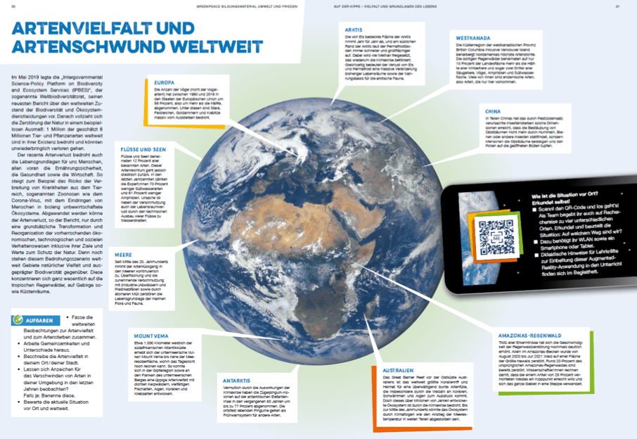 Die Doppelseite „Artenvielfalt und Artenschwund weltweit“ eröffnet zum einen zehn Blitzlichter auf aktuelle Entwicklungen und zugleich über einen QR-Code das Eintauchen in eine „Augmented Reality“. Auf diesem Weg tauchen die Schülerinnen und Schüler mittels virtueller Reisen in das Amazonastiefland, das Great Barriere Reef, die Vogelwelt Europas und über einen Supermarkt zu den Ufern des Victoria-Sees ein. Der Frage „Sind wir auf dem richtigen Weg?“ folgend, erkunden sie Probleme und Lösungsansätze zum Erhalt der Natur und der Artenvielfalt und tragen ihre Erfahrungen und Bewertungen im gemeinsamen Gespräch zusammen.