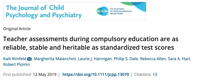 Die Leistungsbeurteilungen der Lehrer sind in jeder Phase der Bildungserfahrung ebenso zuverlässig, stabil und prognostisch valide (~60 %) wie die Testergebnisse. Lehrer- und Testergebnisse korrelieren stark phänotypisch (r ~ .70) und genetisch (genetische Korrelation ~.80), sowohl bei zeitgleichem Vergleich als auch im Zeitverlauf. Frühere Prüfungsleistungen erklären zusätzliche Varianz in standardisierten Prüfungsergebnissen (~10%) im Alter von 16 Jahren, wenn man die Bewertungen der Lehrer kontrolliert. Allerdings erklärt die Prüfungsleistung weniger zusätzliche Varianz im späteren akademischen Erfolg, nämlich ~5 % für Prüfungsnoten mit 18 Jahren und ~3 % für den Hochschulzugang, wenn man die Bewertungen der Lehrer kontrolliert. Lehrerbewertungen sagen auch verlässlich zusätzliche Varianzen bei den späteren Prüfungsleistungen und der Immatrikulation an einer Universität voraus, wenn sie für frühere Prüfungsergebnisse kontrolliert werden.