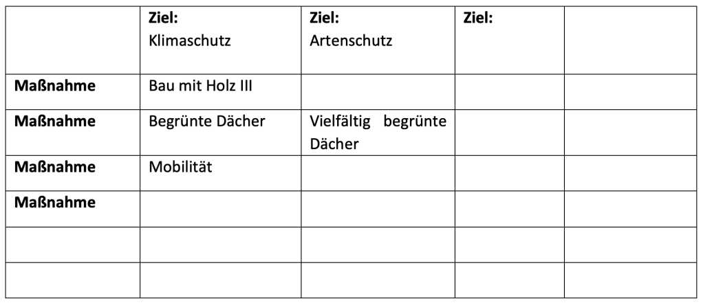 1. Ergänze die Tabelle mit Blick auf die letzten Stunden: Horizontal, die Ziele (z.B. SDGs, Nachhaltigkeitsaspekte), die erreicht werden sollen und vertikal, wie diese erreicht werden können.