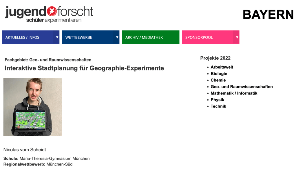Nicolas vom Scheidt ist gerade mal 14 Jahre alt und mit seiner „Interaktiven Stadtplanung“ 2021 erfolgreich beim Wettbewerb „Jugend forscht“ angetreten, um so etwas gegen den Klimawandel zu tun. Er hat eine Software entwickelt, die es möglich macht, interaktiv eine Stadt zu planen und ihre Klimabilanz zu erforschen. Angeregt wurde er durch das Computerspiel Minecraft.