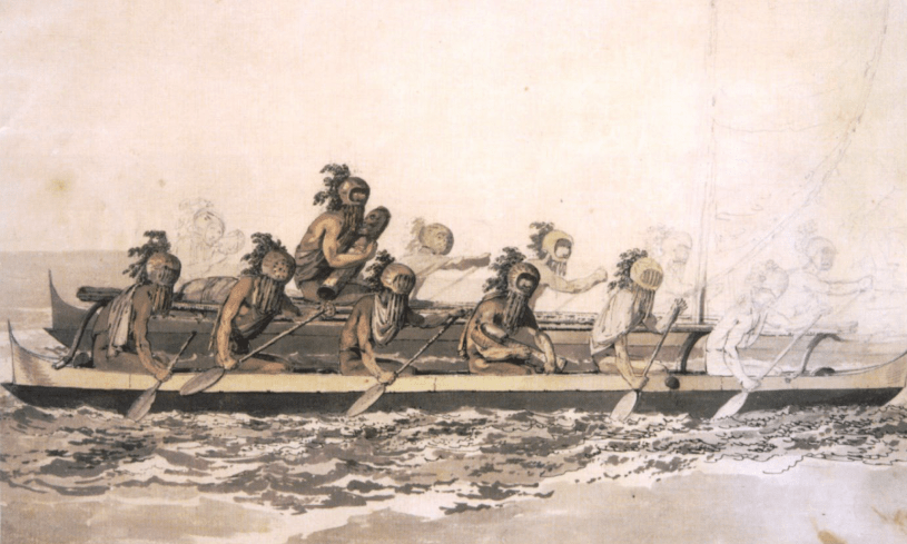 Bild: John Webber, artist aboard Cook’s ship (1778): Canoe of the Sandwich Islands, thr Rowers Masked, graphite, ink, wash and watercolor drawing, Bernice P. Bishop Museum. https://upload.wikimedia.org/wikipedia/commons/d/d1/%27Canoe_of_the_Sandwich_Islands%2C_the_Rowers_Masked%27%2C_ by_John_Webber%2C_c._1778.jpg. Stand: 15.02.2023.