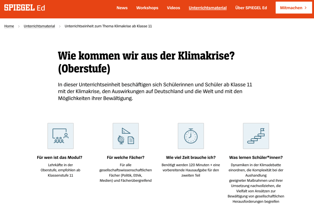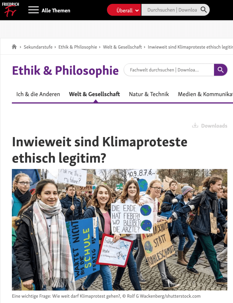In der Unterrichtseinheit „Wie weit darf Klimaprotest gehen?“ von „Zeit für die Schule“ beschäftigen sich Schüler*innen mit der Ethik des zivilen Ungehorsams. Sie erstellen Kriterien für akzeptiertes Protestverhalten, differenzieren zwischen Legalität und Legitimität anhand verschiedener journalistischer Beiträge aus der Wochenzeitung „Die Zeit“ und erörtern unterschiedliche Standpunkte zum gegenwärtigen Klimaaktivismus.