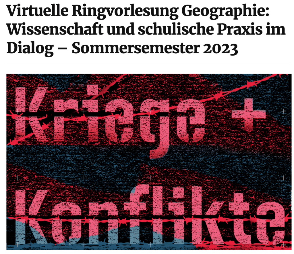 Dieser Beitrag wird als Unterrichtsbeispiel im Rahmen der Virtuellen Ringvorlesung Geographie (=Teil der roadmap-Initiative 2030) vorgestellt: 4. Juli 2023, 16:00-18:00 Uhr c.t. Titel: Kriege und Konflikte – schulpraktische Perspektiven Vortrag: PD Dr. Stefan Applis, StD, Discussant: Prof. Dr. Nicole Raschke: Zoom-Link: https://uni-bonn.zoom.us/j/68292455901?pwd=NkhNTXZvM3hsV2JUenA0bTkrbEhXQT09