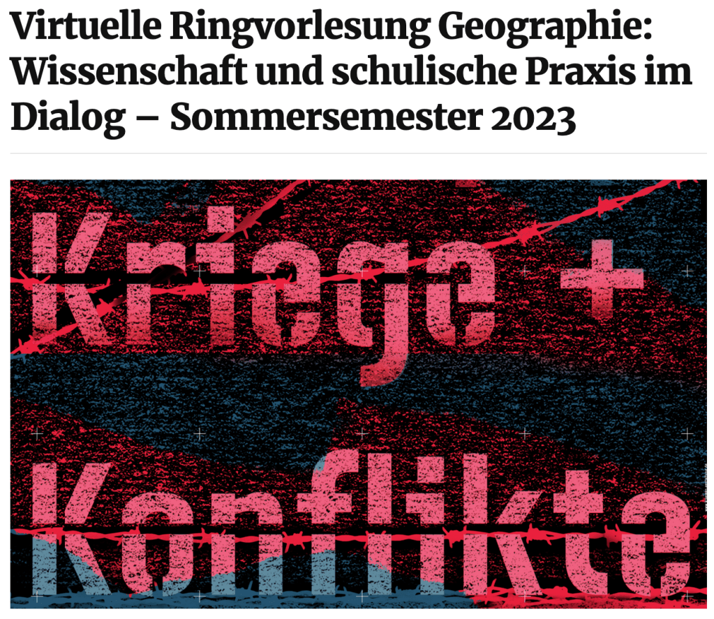 Dieser Beitrag wird als Unterrichtsbeispiel im Rahmen der Virtuellen Ringvorlesung Geographie (=Teil der roadmap-Initiative 2030) vorgestellt: 4. Juli 2023, 16:00-18:00 Uhr c.t. Titel: Kriege und Konflikte – schulpraktische Perspektiven Vortrag: PD Dr. Stefan Applis, StD, Discussant: Prof. Dr. Nicole Raschke; Zoom-Link: https://uni-bonn.zoom.us/j/68292455901?pwd=NkhNTXZvM3hsV2JUenA0bTkrbEhXQT09