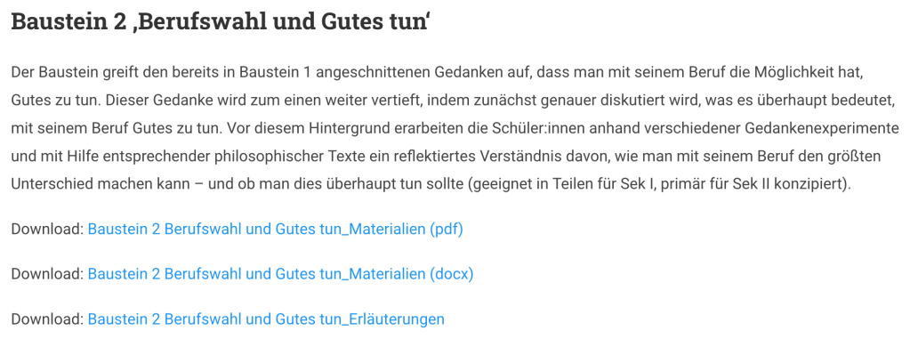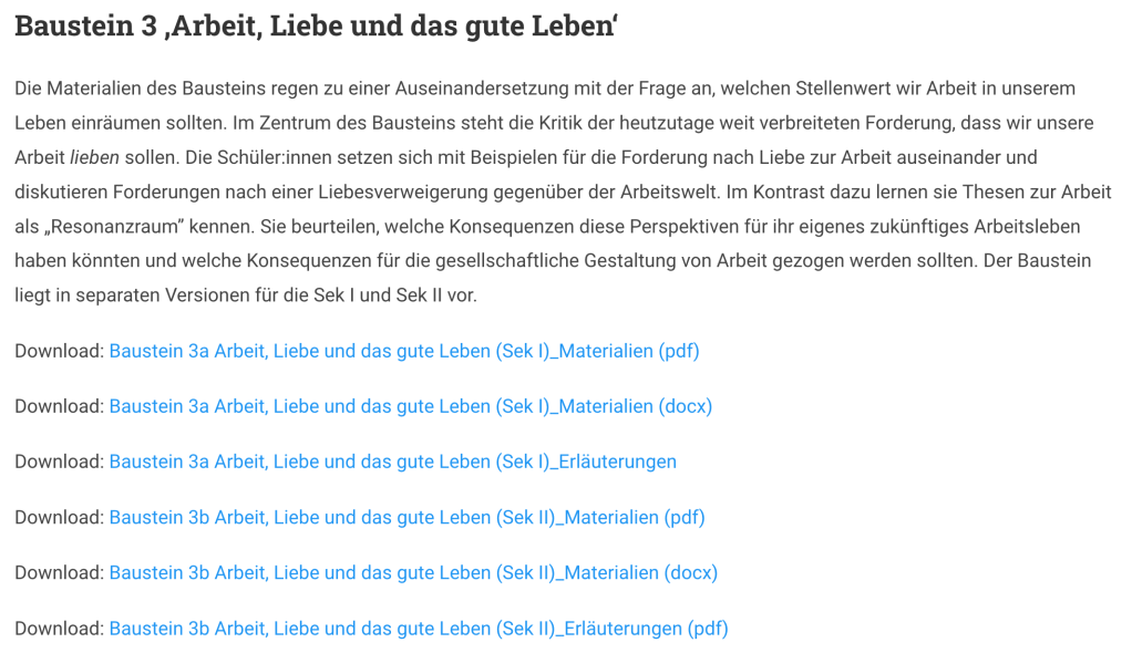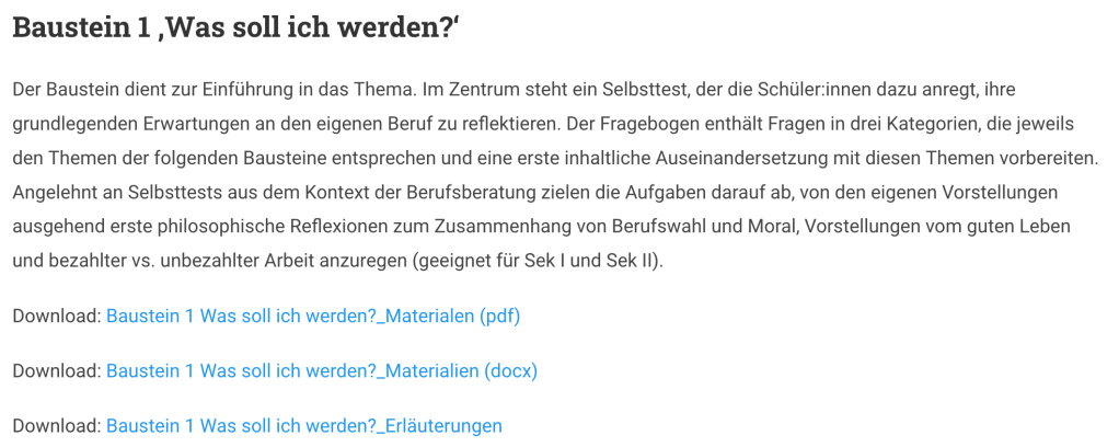 Die von der Arbeitsgruppe um die Philosophie- und Ethikdidaktikerin Anne Burkard an der Universität Göttingen bereitgestellten Unterrichtsbausteine gehen von der Annahme aus, dass eine Reflexion über grundlegende Erwartungen an den eigenen Beruf, über gesellschaftliche Rahmenbedingungen von Erwerbs- und Sorgearbeit sowie über Gestaltungsmöglichkeiten gerechter Arbeitsbedingungen bedeutsam für die Berufswahl und die damit verbundenen Fragen nach dem guten Leben von Jugendlichen sind. Da die Philosophie einen wichtigen Beitrag dazu leisten kann, diese Reflexionsprozesse anzustoßen und zu unterstützen, bieten die Bausteine Materialien, die Fragen nach einem geeigneten Beruf mit individualethischen und moralphilosophischen Fragen sowie mit Perspektiven aus Sozialphilosophie und feministischer Philosophie verbinden.