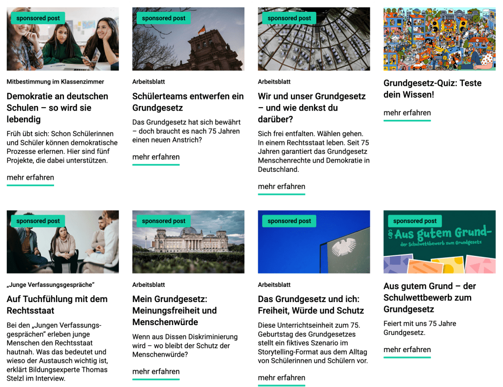 Die meisten Angebote richten sich an höhere Jahrgangsstufen wie die folgende Unterrichtseinheit, in der die Schüler*innen innerhalb einer Art Gedankenexperiment darüber nachdenken sollen, wie eine „neues Grundgesetz 2.0“ aussehen könnte, das ihren Wertvorstellungen und Alltagserfahrungen entspricht; einzige Bedingung: Alle Regeln, Inhalte und Bestimmungen müssen am Gemeinwohl ausgerichtet sein…