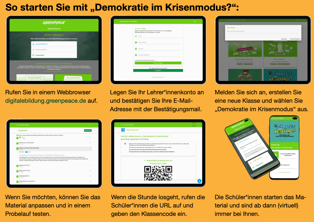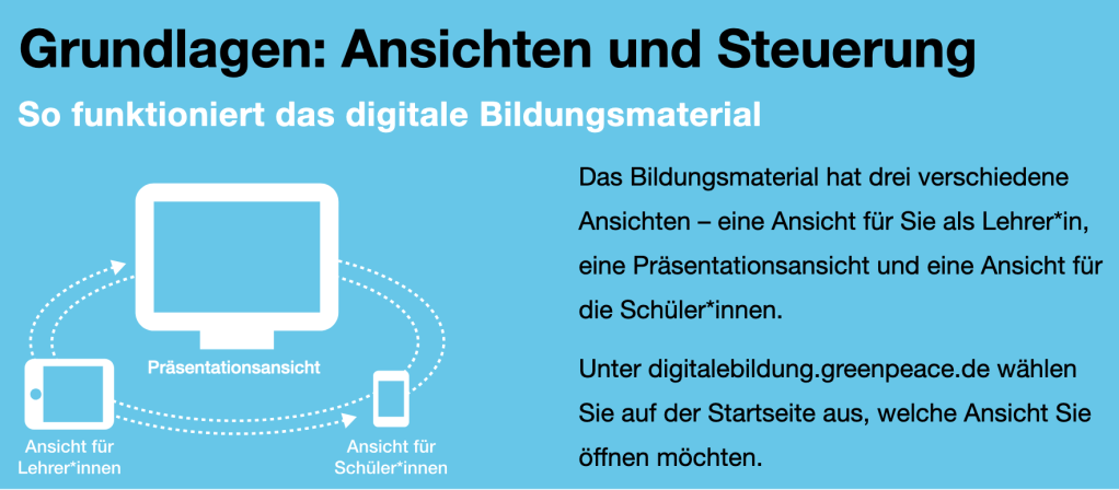 Greenpeace bietet digitales Unterrichtsmaterial zu aktuellen Umweltthemen an, das vorwiegend aus der Zeit der Corona-Krise stammt, in der digitales Material gefragt war, das Ansprüche an rein digitale und hybride Unterrichtsformate erfüllte. Das Material strebt generell einen respektvollen, nachhaltigen Umgang mit unseren Lebensgrundlagen, auch den sozialen wie demokratischen Umgangsformen und fördert entsprechend einen debattenorientierten Unterricht, der zur aktiven Beteiligung und Mitgestaltung anregt. Die Erfahrungen der Corona-Krise sind für Schüler*innen noch immer präsent und der Umgang damit prägt bis heute Debatten, von denen vor allem Rechte Strömungen profitieren. Entsprechend wird das Material als Grundlage für weiterführende demokratiebezogenen Fragestellungen empfohlen, auch wenn es sich zunächst vornehmlich das Ziel gesetzt hat, ganz unmittelbare Erfahrungen der Corona-Krise zu reflektieren.