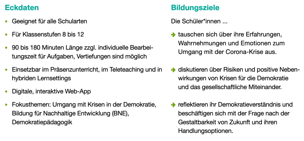 - Die Krise eröffnet zugleich die Notwendigkeit wie auch zahlreiche Möglichkeiten, demokratische Schlüsselkompetenzen und Überzeugungen der Schüler*innen zu stärken, von denen entscheidend abhängt, wie sie mit den Unsicherheiten und Ambiguitäten der Corona-Krise umgehen können.