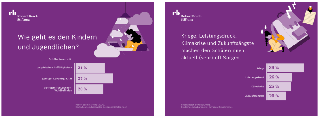 Die Ergebnisse sind alarmierend: Die psychische Gesundheit und das Wohlbefinden der Kinder und Jugendlichen sind immer noch deutlich unter dem Niveau vor der Corona-Pandemie. Ein Viertel der Jugendlichen schätzt die eigene Lebensqualität als gering ein. Zwei Drittel bewerten sie als mittel und nur sechs Prozent als hoch. Ungefähr ein Fünftel der Schüler:innen bezeichnet sich selbst als psychisch belastet. Ebenso viele klagen über ein geringes schulisches Wohlbefinden, bei Kindern aus Familien mit niedrigem Einkommen sogar knapp jedes Dritte. Die Kriege in der Welt, der Leistungsdruck in der Schule, die globale Klimakrise und die Ängste vor der eigenen Zukunft bereiten ihnen die meisten Sorgen. (Deutsches Schulbarometer 2024)