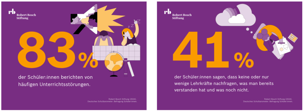 Mit dem Deutschen Schulbarometer versucht die Robert-Bosch-Stifung in Zusammenarbeit mit Wissenschaftler*innen aus verschiedenen Disziplinen (Prof. Julian Schmitz, wissenschaftliche Projektleitung; Anna-Lina Rauschenbach, Arbeitsgruppe Klinische Kinder- und Jugendpsychologie, Universität Leipzig; Prof. Henrik Saalbach und Dr. Franziska Greiner-Döchert, Arbeitsgruppe für Pädagogische Psychologie mit dem Schwerpunkt Lehren, Lernen und Entwicklung, Universität Leipzig; Prof. Eva Baumann, Hochschule für Musik, Theater und Medien Hannover) frühzeitig Entwicklungen zu beschreiben, „indem Beobachtungen und Einschätzungen von Personen erfasst und untersucht werden, die Schulen täglich mitgestalten und erleben. Aktuelle Herausforderungen und Bedarfe können so erkannt und daraus Empfehlungen für Entscheidungsträger: innen im Bildungssystem abgeleitet werden. Das Deutsche Schulbarometer wurde in 2024 umfassend weiterentwickelt und besteht aus drei Befragungsinstrumenten.“ (Deutsches Schulbarometer 2025)