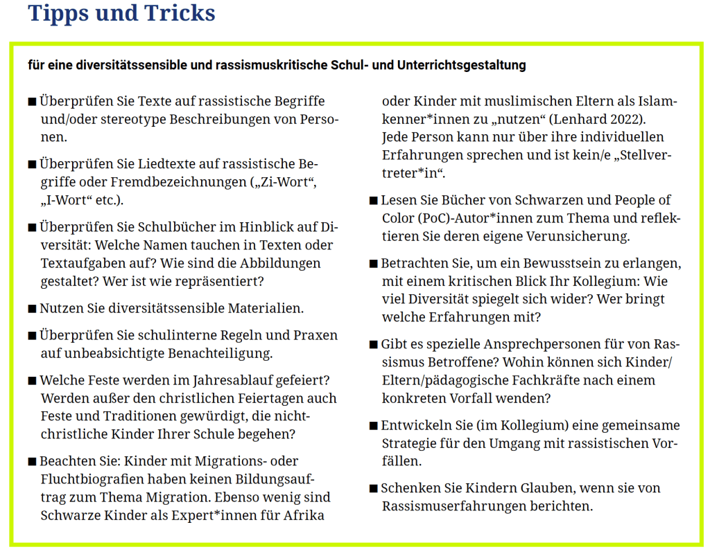 Schule als Institution ist dazu verpflichtet, Diskriminierung zu verhindern – auf allen Ebenen. Gerade zur institutionellen Diskriminierung an Schulen gibt es eine lange Tradition der Auseinandersetzung, während die Vermeidung von interpersoneller Diskriminierung (Diskriminierung, die in der Interaktion zwischen Menschen stattfindet) oft einfach als pädagogischer Auftrag an die Lehrkräfte weitergegeben wird. Dieser Auftrag hat eine enorme Bedeutung, wenn man bedenkt, dass (Alltags)Rassismus – wie Verletzungen durch Sprache in Form von Beschimpfungen und Schimpfwörtern, Ausschlüsse, Othering und Mikroaggressionen – massive Auswirkungen auf die Betroffenen hat. (Stiftung Lesen 2023)