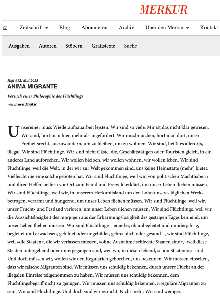 Mit seinem Essay „Anima migrante“ versucht sich Ernest Mujkič an einer Philosophie des Flüchtlings, die er mit seinen eigenen Erfahrungen als Migrant konfrontiert. Der Essay endet mit Schlussfolgerungen, denen wohl mancher ganz selbstverständlich zustimmen wird, davon ausgehend, dass der rechtliche Status von Flüchtenden mit deren moralischen Status übereinstimme – jedenfalls de jure, ganz unabhängig von politisch oft abweichenden Verlautbarungen: