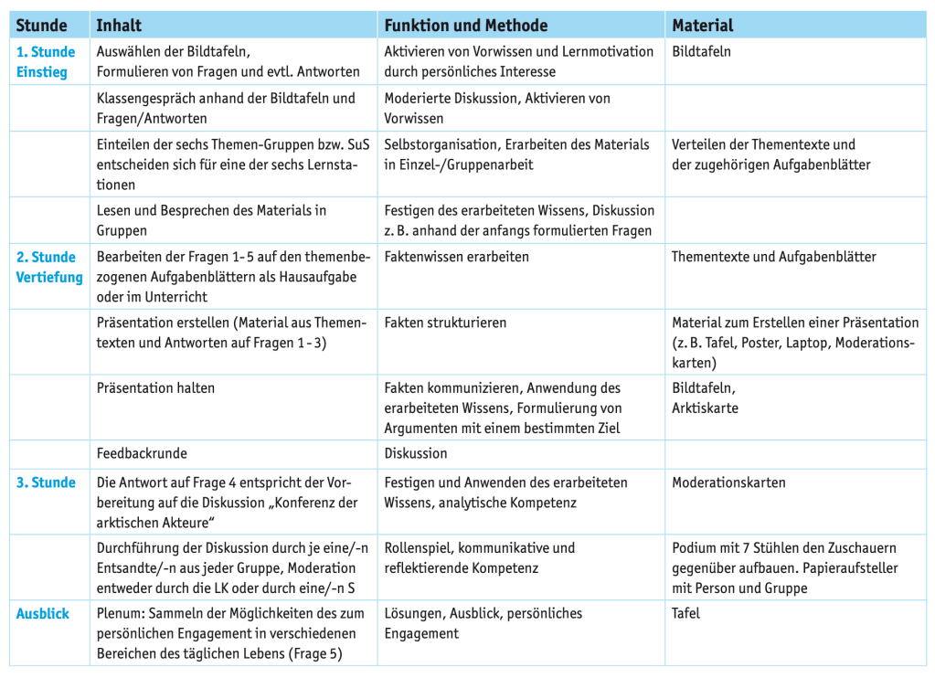 Das vorgelegte Unterrichtsmaterial nähert sich den Gegebenheiten und Problemen der Region Arktis aus unterschiedlichen themen- und raumbezogenen Blickwinkeln. Die Unterrichtssequenz für die Sekundarstufen I und II (Mittelstufe) gibt detaillierten Input, ist aber offen gehalten und animiert die Schülerinnen und Schüler (SuS) dazu, tiefer in das Thema einzusteigen und eine fundierte persönliche Haltung zu entwickeln. Unterschiedliche Fragestellungen behandeln die Gegebenheiten im hohen Norden: Wer lebt dort? Was hat sich dort in den letzten Jahrzehnten verändert? Wer würde gern über die Arktis bestimmen und warum? Was macht den Lebensraum Arktis aus? In welcher Weise ist das arktische Meer vom Klimawandel betroffen? Welche Bedeutung hat die Region für die industrielle Fischerei, als Erdölreservoir und nicht zuletzt als politischer Raum? Die Arktis ist in großer Gefahr. Inwieweit kann die Einrichtung eines Schutzgebietes Arktis noch gegensteuern? Verschiedene Teilaspekte geben Aufschluss über diese Fragestellungen.