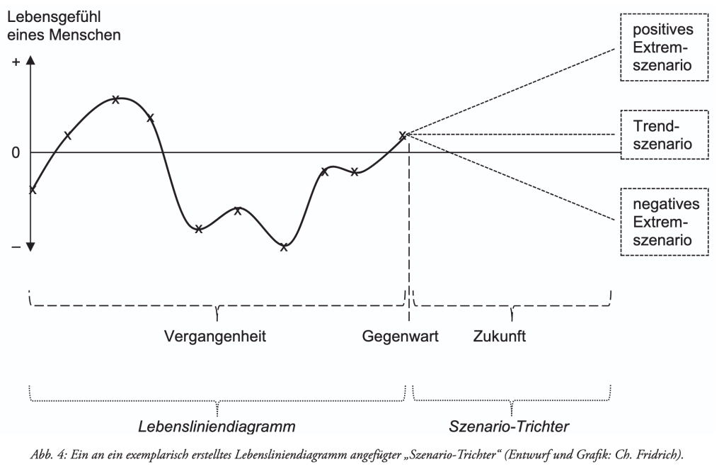 Im Unterrichtskontext können leistungsstärkere Schüler/innen bzw. Klassen unmittelbar an das Lebensliniendiagramm mögliche Entwicklungswege mittels einer modifizierten Variante der Szenariotechnik (z. B. Reich o.J., 4 ff .; Retzmann 2011, 182 ff .) anschließen. Bei dieser geht es darum, Einflussfaktoren und -bereiche auf die Lebenssituation von Subjekten zu identifizieren und die Bedeutung für deren Lebenslagen herauszuarbeiten. Anschließend soll auf dieser Basis ein begründetes positives und ein negatives Extremszenario sowie außerdem ein wahrscheinliches Trendszenario zum Beispiel für ein/e Asylwerber/in in Österreich erarbeitet und beschrieben werden. Dabei werden – unter Berücksichtigung von aktuel-len Einfl ussnahmen und Interessen unterschiedlicher gesellschaftlicher Gruppen – mögliche Zukunftsbilder entwickelt, wodurch an das vorliegende Lebenslini-endiagramm gleichsam ein trichterförmiges Gebilde (vgl. auch Reich o.J., 8) angeschlossen werden kann (siehe Abb. 4). Je weiter eine künftige Entwicklung von der Gegenwart entfernt liegt, desto vager werden die möglichen zu erwartenden Situationen, weswegen zwischen sehr positiven oder sehr negativen Situationen viele Zustände denkbar sind.