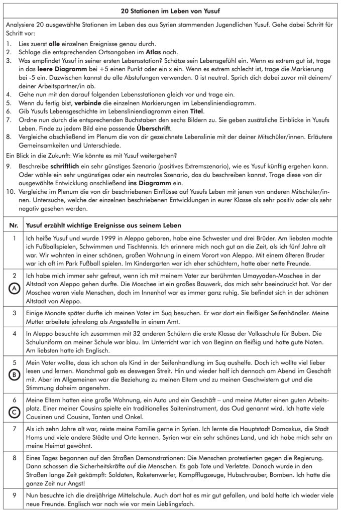 Gesellschaftliche und politische Diskurse über sozioökonomische Phänomene und Prozesse, wie etwa über den Themenkomplex Flucht – Flüchtlinge – Asyl, verlaufen im Allgemeinen auf einer abstrahierten und anonymisierten Ebene. Auch im Geographie- und Wirtschaftskunde-Unterricht sind verallgemeinernde, deduktive Darstellungen häufig anzutreffen. In diesem Beitrag wird für einen Perspektivenwechsel plädiert, der zum Beispiel mit der Methode „Lebensliniendiagramm“ eingeleitet werden kann. Schüler/innen versetzen sich in die Lebenslage eines Menschen, in diesem Fallbeispiel eines minderjährigen syrischen Flüchtlings, bewerten sein Lebensgefühl und entwerfen ggf. im Anschluss mit Hilfe der Szenariotechnik Entwicklungsperspektiven für diesen Menschen. Dieser subjektzentrierte Zugang eröffnet die Chance auf eine andere Sichtweise und auf eine größere Sensibilisierung für das Schicksal und die Herausforderung anderer Menschen – und nicht zuletzt auf ein kritisches Überdenken des eigenen Standpunkts.