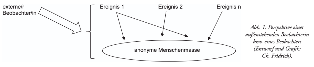 Immer wieder tauchen Medienberichte über sozioökonomische und politische Ereignisse auf, die unangemessene Naturgesetzlichkeiten unterstellen, wie etwa jene Schlagzeile: „Neue Flüchtlingswelle rollt auf Europa zu“ (Kronen Zeitung vom 16.05.2014). Diese Aussage enthält, wie etwa die Bezeichnung „Flüchtlingsstrom“ (z. B. bild.tv vom 14.09.2015), eine anonymisierende Abstrahierung menschlicher Schickale. Die Begriffe „Welle“ und „Strom“ entstammen Naturbeschreibungen, stellen somit Naturalisierungen dar und erlangen in den Beschreibungen eigene Handlungsfähigkeit, weswegen hier von Reifikationen gesprochen werden kann. Zudem ist der mediale Diskurs mit teilweise kühler Distanziertheit durch Verwendung inadäquater Begriffe, wie etwa „Flüchtlings-Explosion“ (z. B. ShortNews vom 13.04.2014), geprägt. Diese weit verbreitete Semantik trägt zur Stereotypenbildung bei und ist als problematisch einzustufen, denn es geht um Menschen sowie deren Leben und Schicksal, nicht um unabwendbare Katastrophen. Eine derartige mediale Berichterstattung hat eines gemeinsam: In den Diskurs werden Metaphern eingebracht, die Menschen oder gar menschliche Schicksale ausblenden und außer Acht lassen. Dies führt neben den fast kontinuierlich gemeldeten Zahlen über auf der Flucht verunglückte und gestorbene Schutzsuchende zu einer Abstumpfung bei Menschen in Österreich und generell im globalen Norden. Deren Blickwinkel entspricht externen Beobachter/innen, die auf Ereignisse, wie etwa Kriegsereignisse, blicken, welche in Form von Reiz und Reaktion wiederum auf anonyme Menschenmassen wirken (siehe Abb. 1).