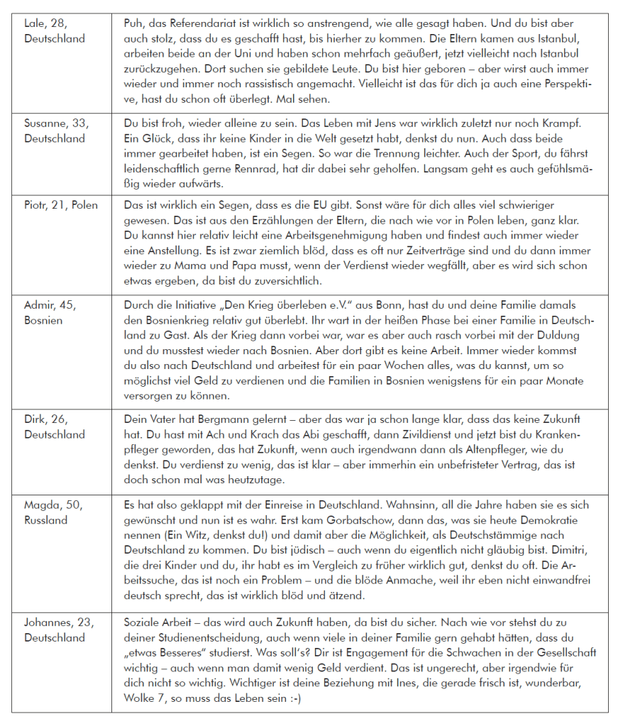 Hinweis: Das vollständige Unterrichtsmaterial und eine differenzierte Beschreibung des unterrichtlichen Durchgangs finden sich im pdf des Beitrages Stefan Padberg (2012). Illegalisiert in Deutschland: Wie sähe mein Leben ohne Papiere aus? In GW-Unterricht, 128, 18-27.
