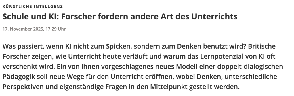 Der folgende Beitrag auf mdr-Wissen trägt Ergebnisse zu Bedingungen eines gelingenden Einsatzes von KI im Unterricht vor, die aus einer 2025 erscheinen Stude zweier britischer Unterrichtsforscher*innen formuliert wurden; diese Empfehlungen stehen in der Tradition kritisch-konstruktivistischer Lehr-Lern-Theorien und wenden sich stark gegen im Schulwesen immer noch verbreiteten Vorstellungen von Schule als Vermittlerin von Inhaltswissen.