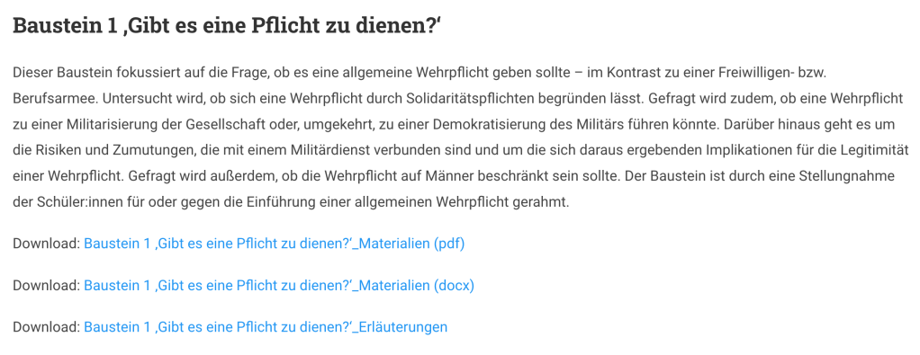 Vor dem Hintergrund der gegenwärtigen geopolitischen Lage wird in Deutschland intensiv diskutiert, ob die Wehrpflicht wieder in Kraft gesetzt oder in neuer Form eingeführt werden soll. Die von Philovernetzt zur Verfügung gestellten Unterrichtsbausteine knüpfen an diese aktuellen Debatten an und nehmen die grundlegenderen philosophischen Fragen in den Blick, die damit verbunden sind. Dabei liegt ein erster Fokus auf der Frage, wie eine Armee mit Wehrpflicht im Vergleich zu einer Berufsarmee moralisch zu beurteilen ist (Baustein 1). Der zweite Themenschwerpunkt adressiert Fragen, die die Legitimität einer Verweigerung des Kriegsdienstes betreffen (Baustein 2).